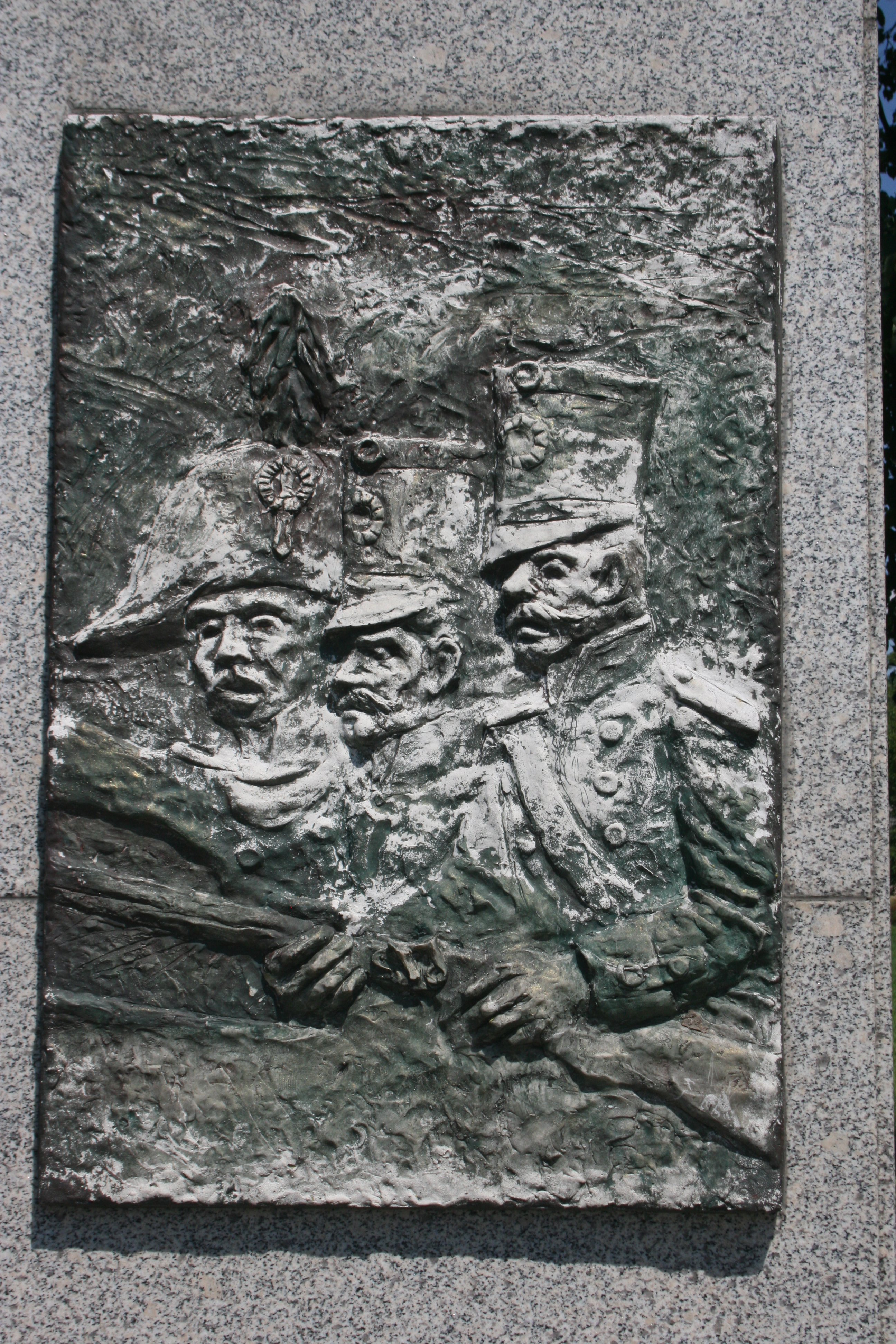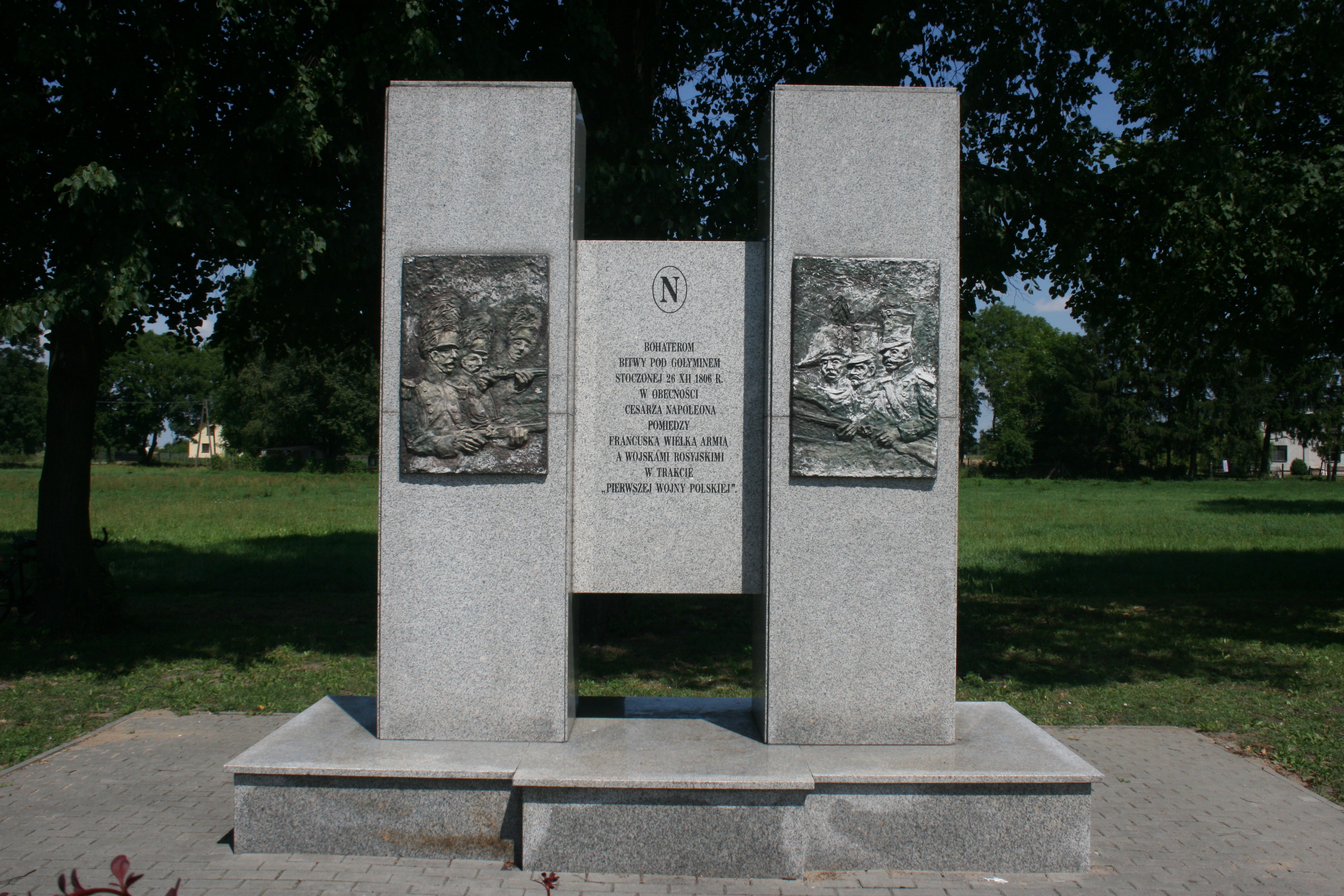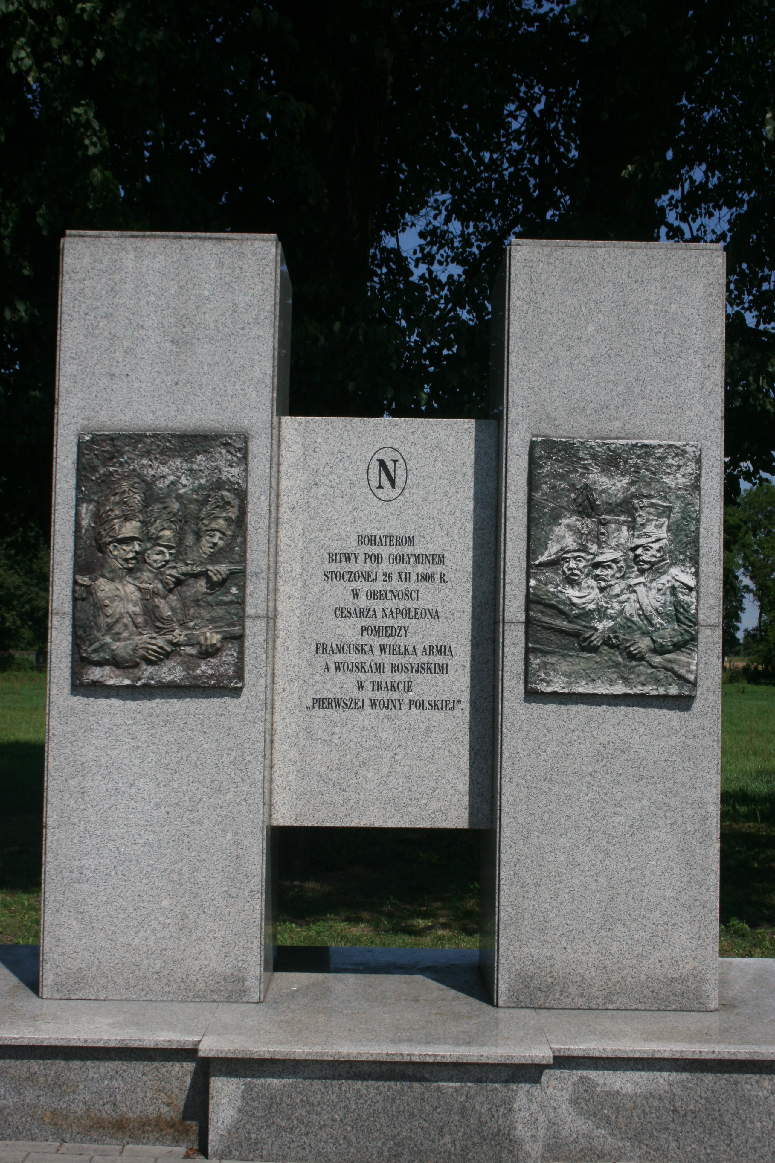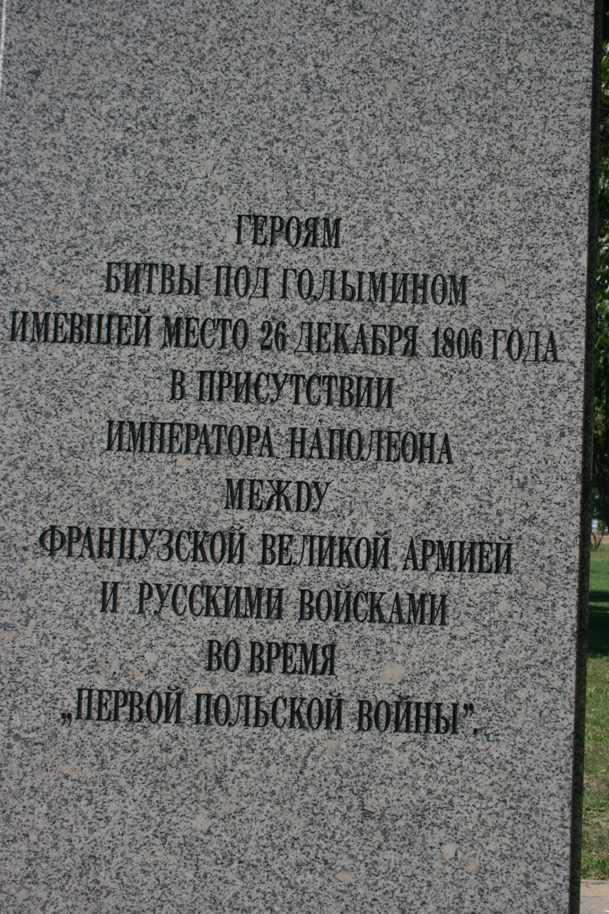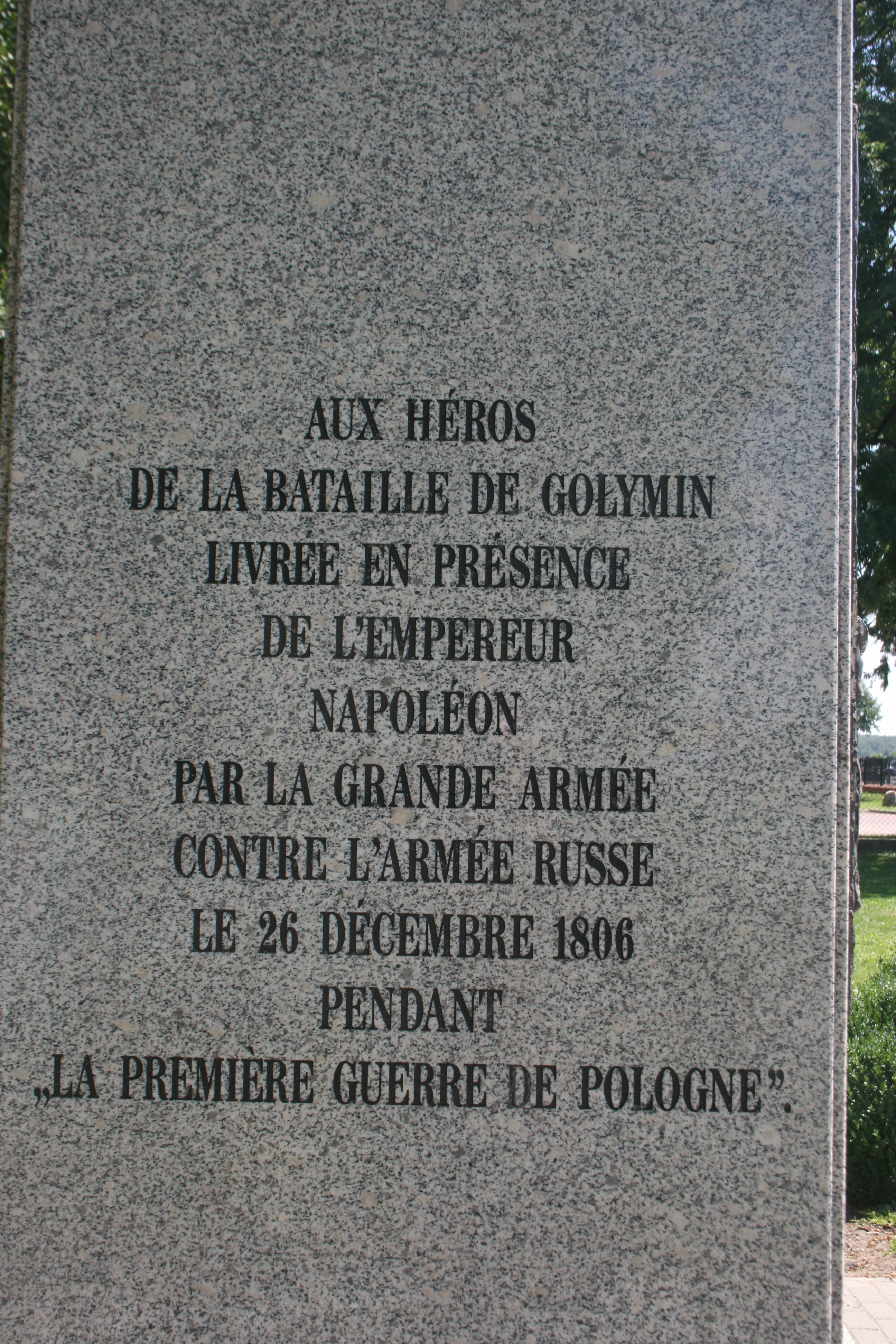 Napis na pomniku brzmi: „ Bohaterom bitwy pod Gołyminem stoczonej 26 XII 1806 r. w obecności cesarza Napoleona pomiędzy Francuską Wielką Armią a Wojskami Rosyjskimi w trakcie Pierwszej Wojny Polskiej”. Ten sam napis w języku rosyjskim mieści się z prawej strony pomnika, zaś w języku francuskim z lewej.