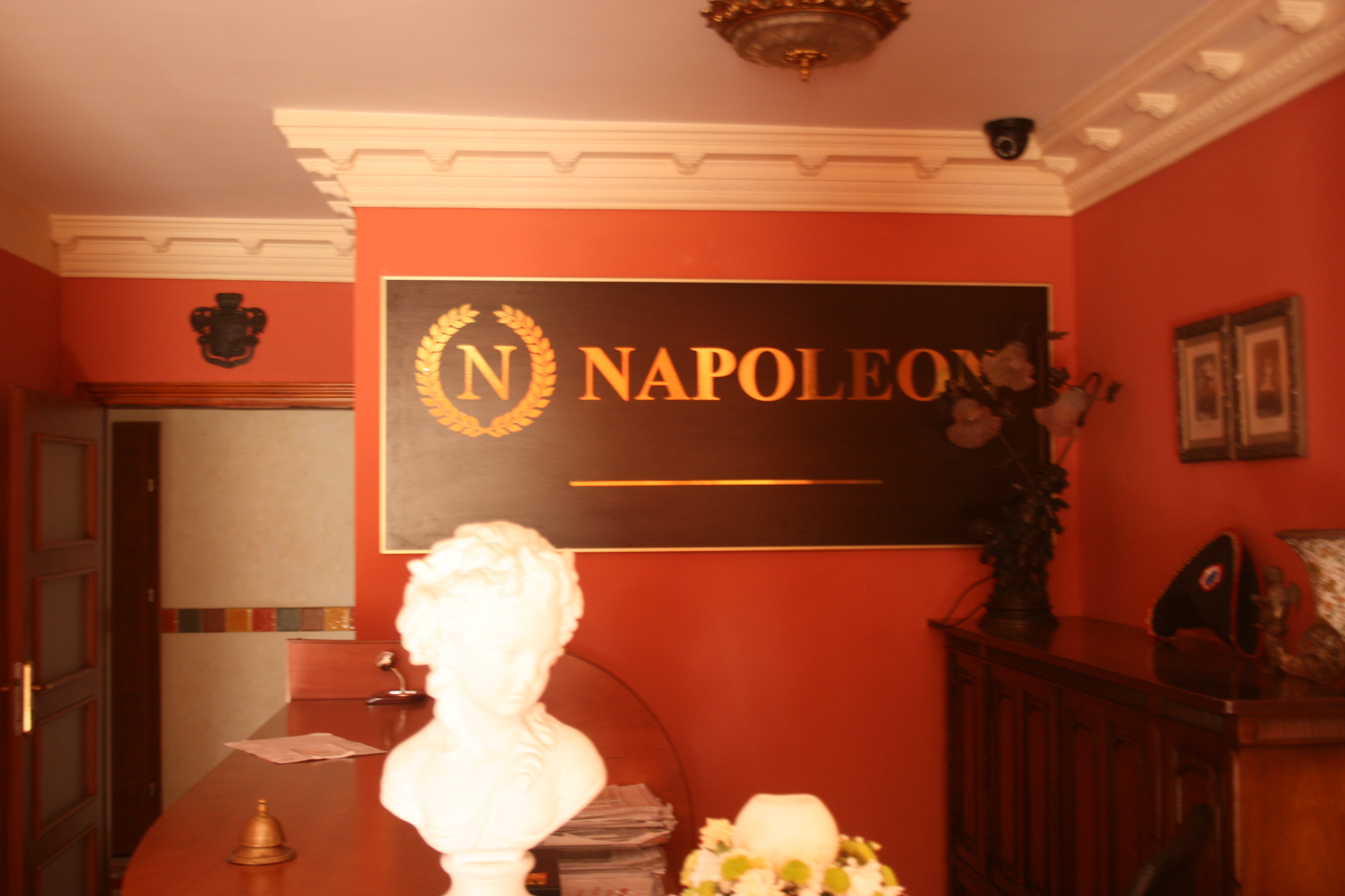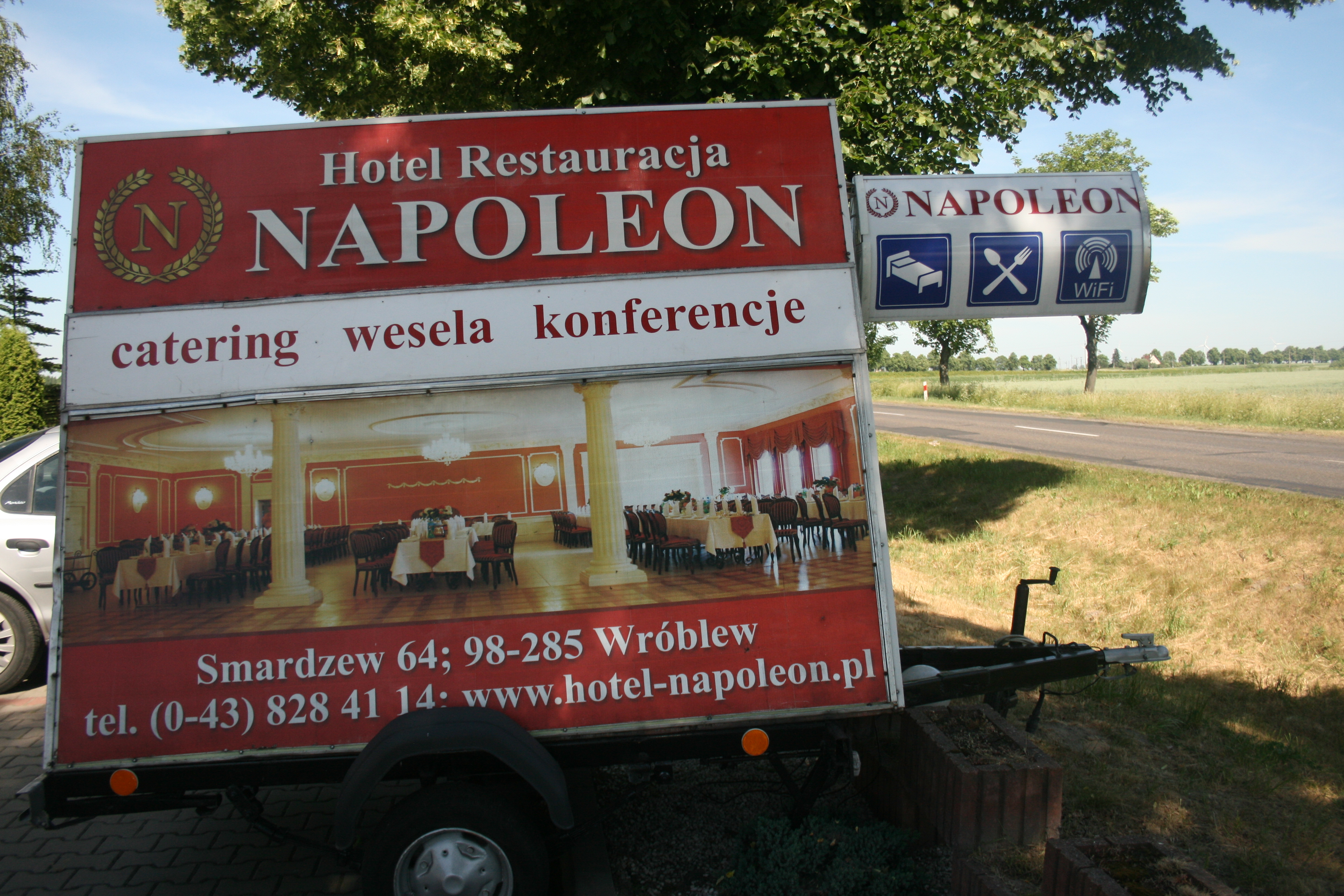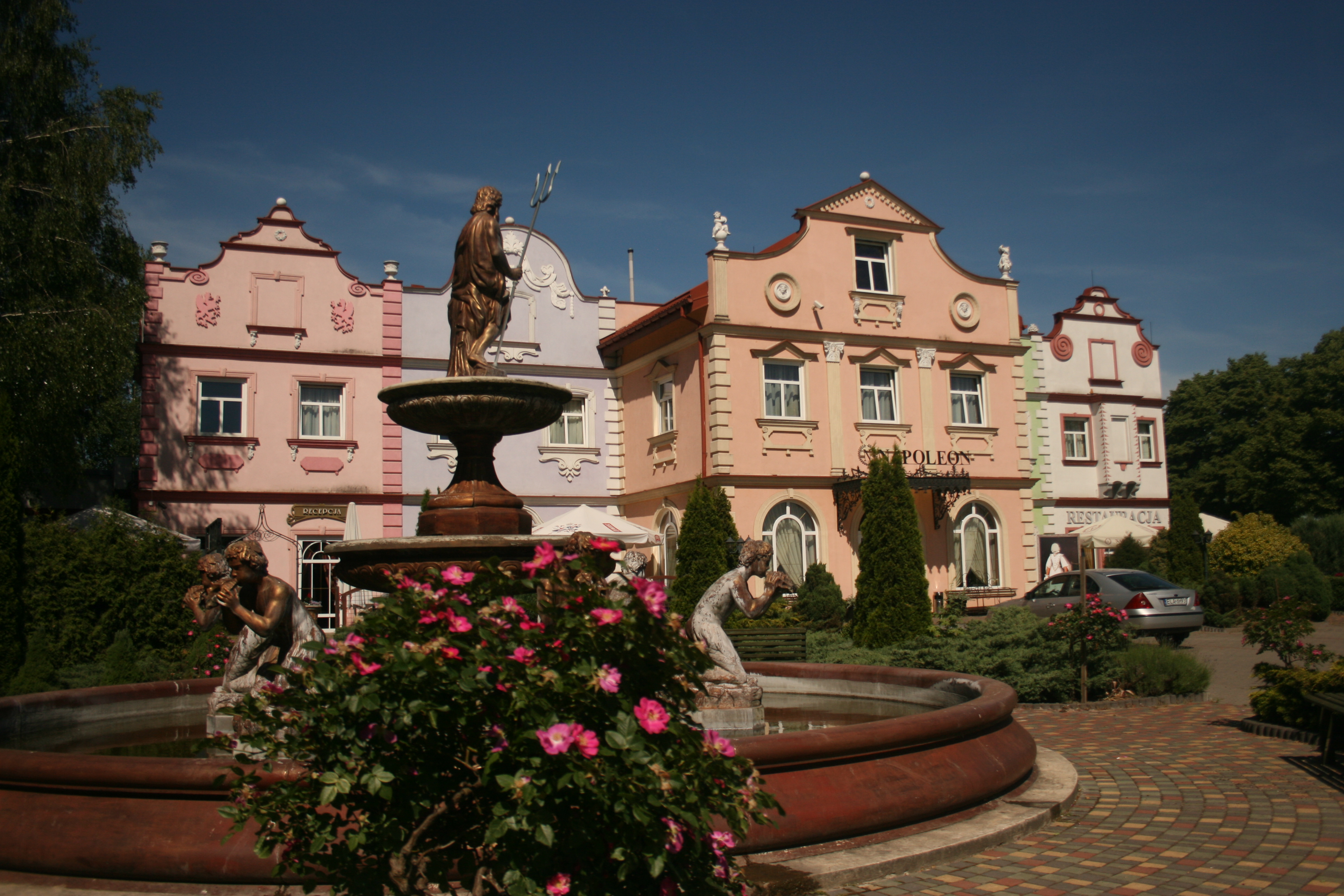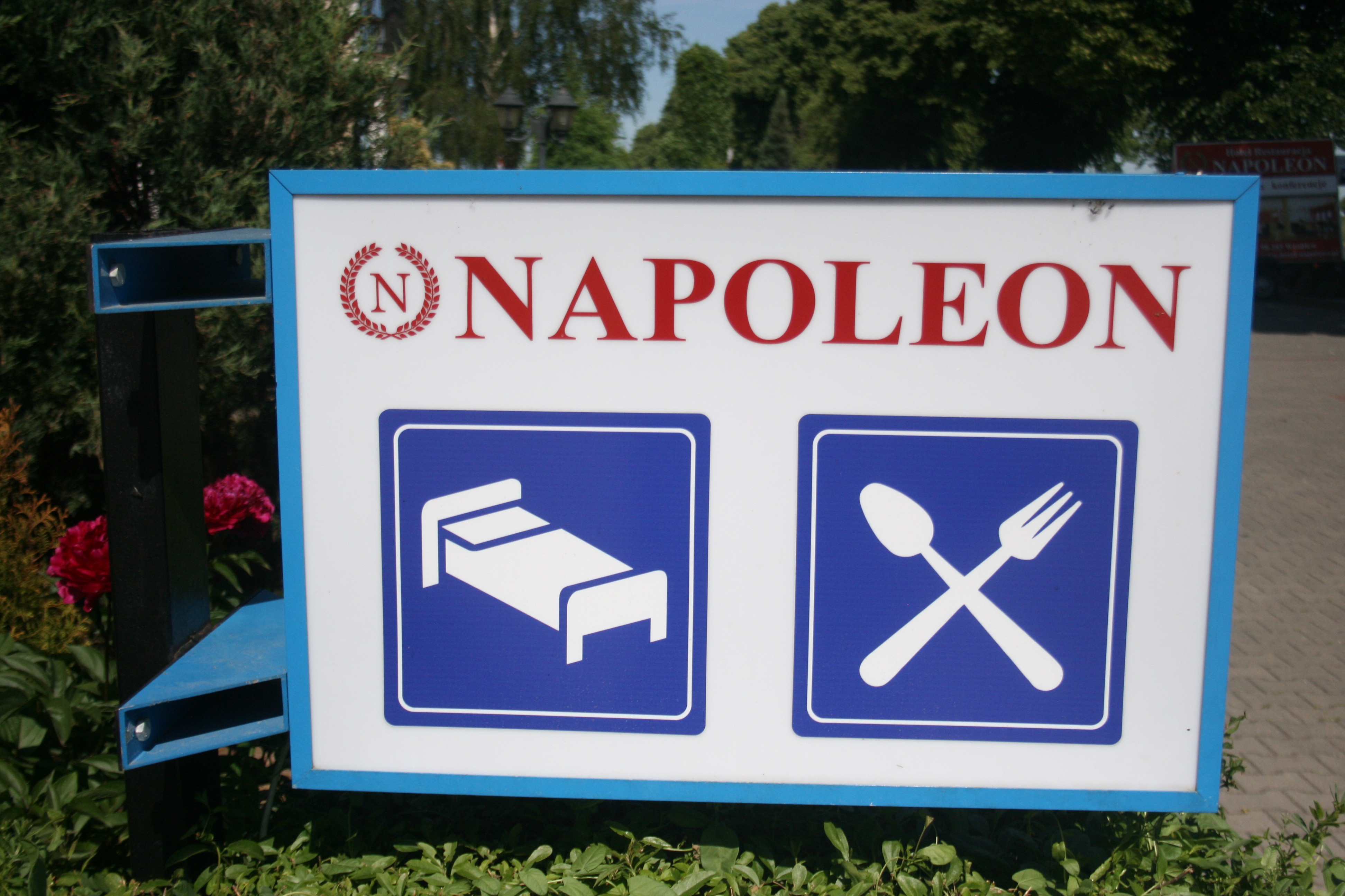 Hotel Napoleon stoi przy szosie. Parking, fontanna, zadbane trawniki. Hotel dysponuje 23 miejscami noclegowymi, ale żyje chyba tylko z imprez okolicznościowych, wesel. Gdy przyjeżdżam, cały obiekt sprawia wrażenie pustego. Kręcę się po pustych salach, korytarzach, recepcji i restauracji (również noszącej nazwę Napoleon), nie spotykam nikogo. Kilka reprodukcji przedstawiających cesarza wisi na ścianach. Brak jednak jakiejkolwiek atmosfery, co dopiero mówić o napoleońskim duchu. W barku nie było nawet koniaku „Napoleon”…
