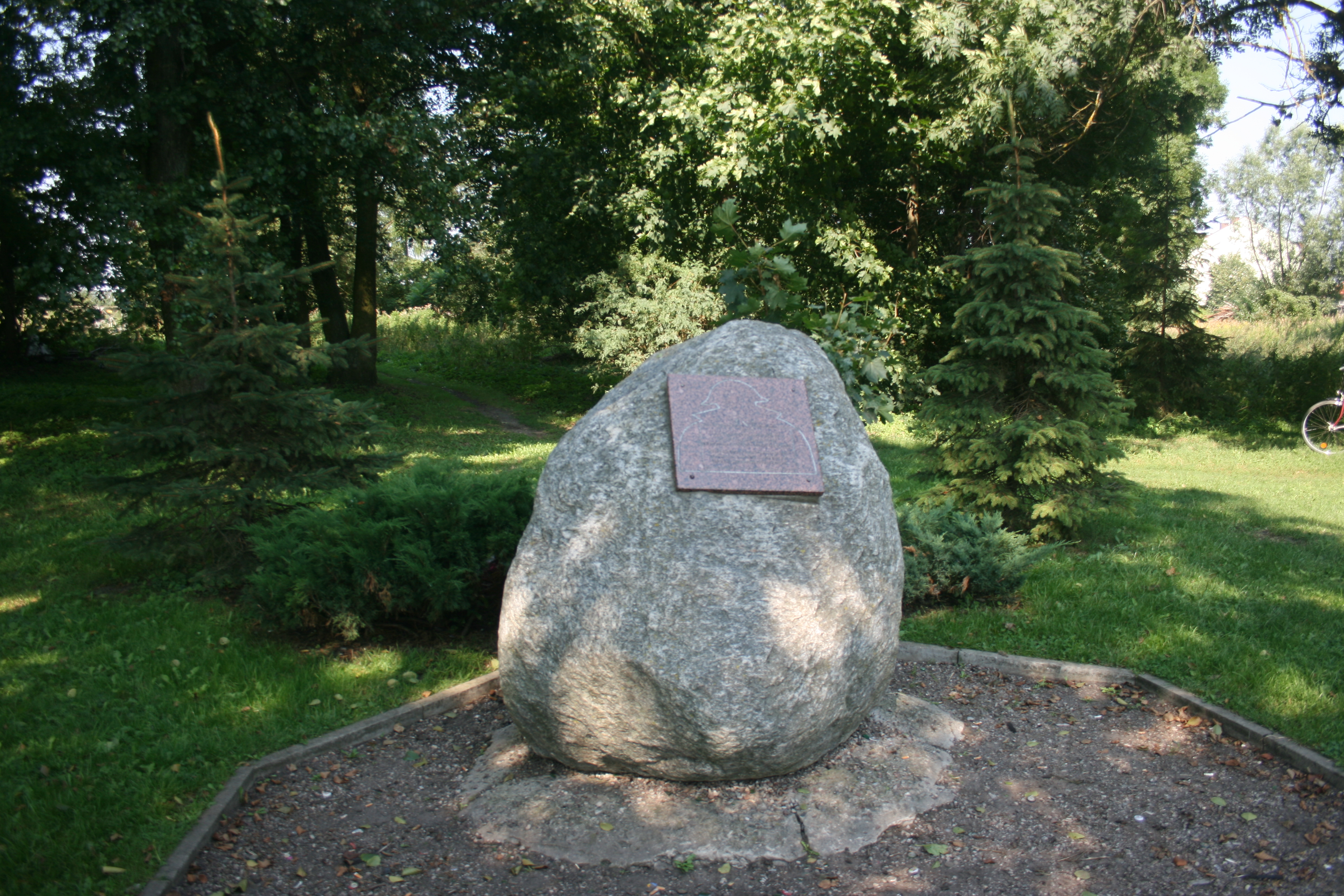 Matka z dzieckiem wychodząca ze sklepu pytana o kamień z tablicą napoleońską odpowiada, ze mieszka tu dopiero siedem lat, mężczyzna z teczką – żebym zapytał w urzędzie; para – że nie sa stad. Dopiero jeden z popijających na murku, na skraju zielonego skweru, miejscowych meneli, prowadzi mnie kilkadziesiąt metrów, na środek trawnika. Na sporym głazie umieszczono tablicę z zarysem kapelusza napoleońskiego i napisem. Mój „przewodnik” prosi, żebym przeczytał napis, bo zapomniał okularów. Potem odchodzi do kumpli, do piwa. Ja, po zrobieniu kilku zdjęć jadę dalej śladami cesarza.
