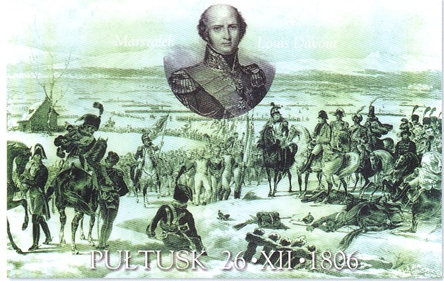 Pocztówka upamiętniająca udział marszałka Davouta w bitwie pod Pułtuskiem, wydana w Pułtusku w 2006 roku.