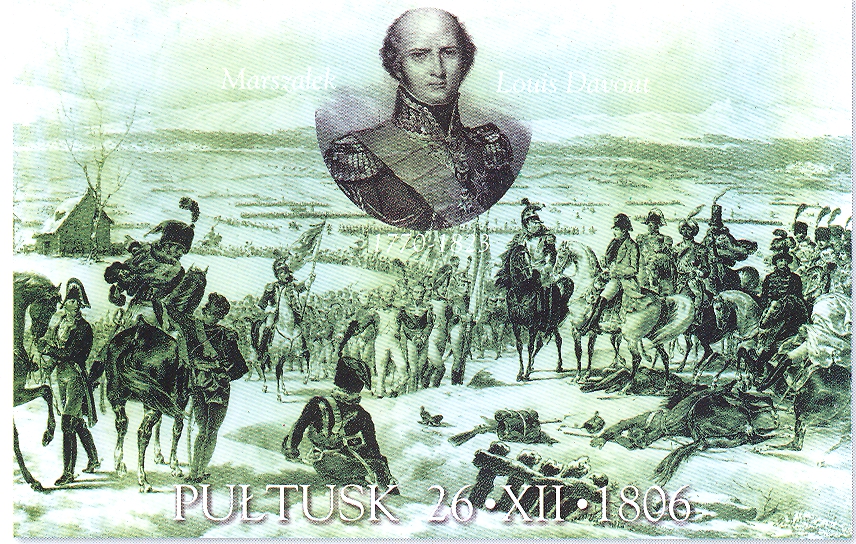 Pocztówka upamiętniająca udział marszałka Davouta w bitwie pod Pułtuskiem, wydana w Pułtusku w 2006 roku.
