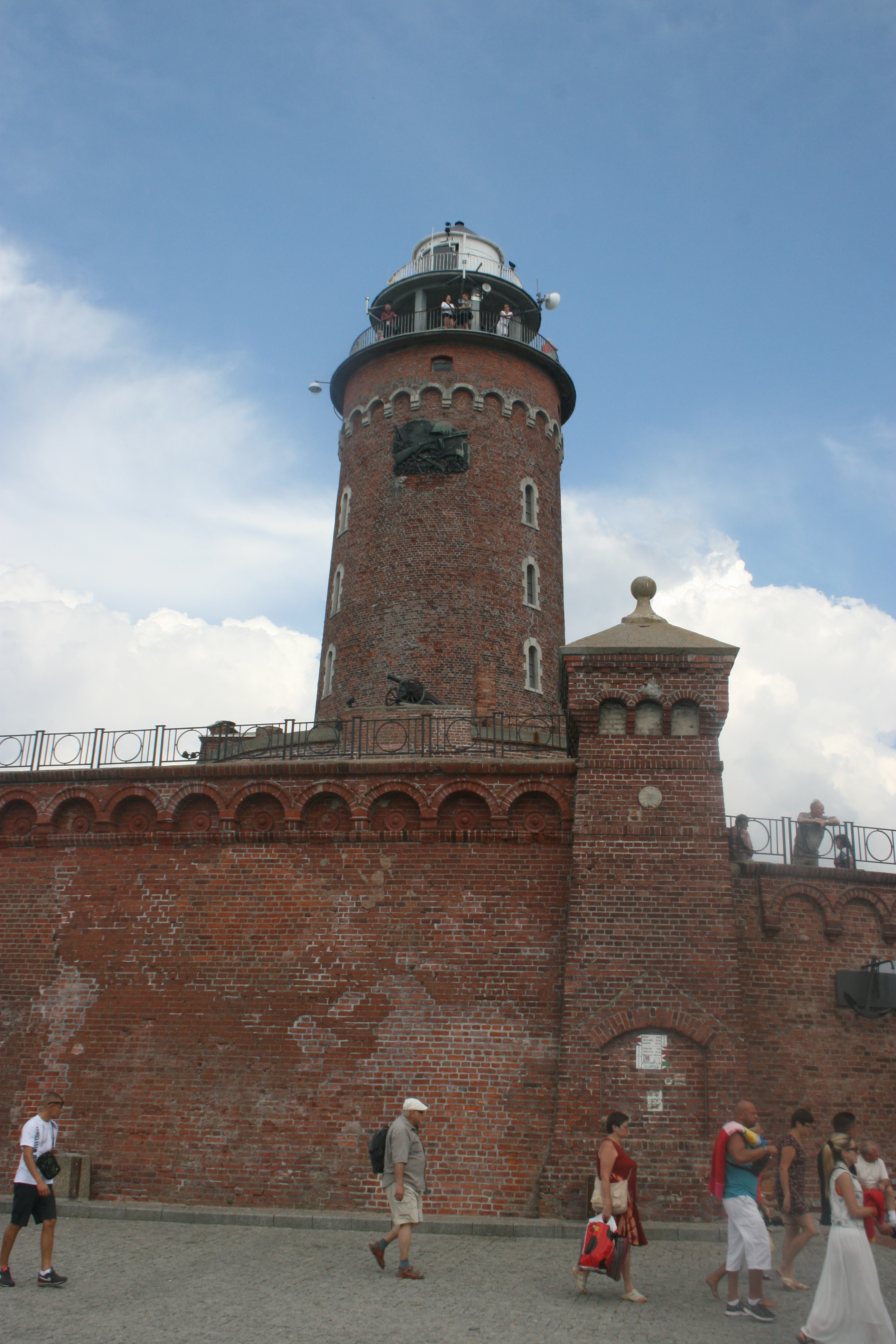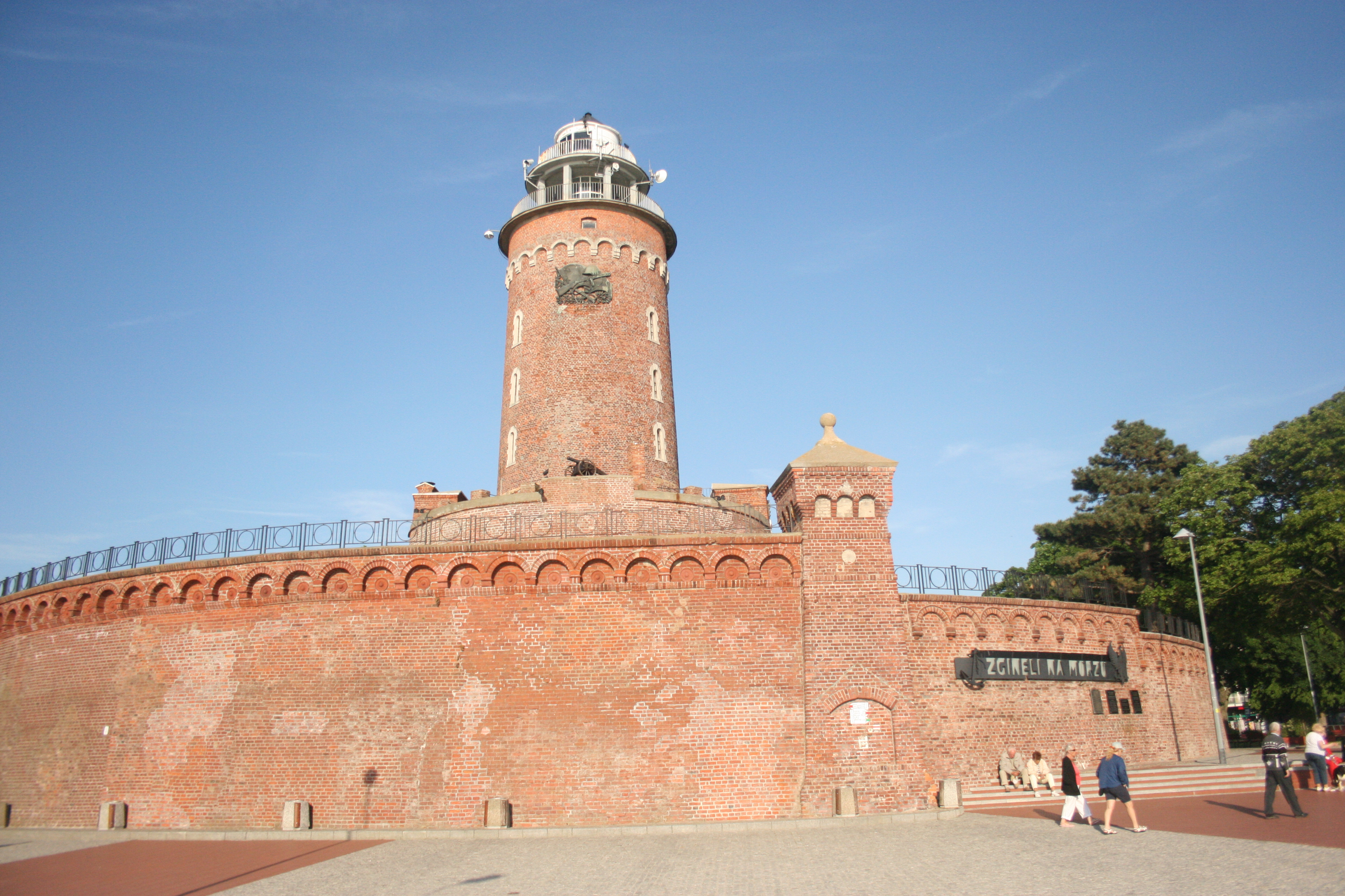 Latarnia morska jest niższa, ma wysokość 26 metrów, ale jest na pewno jednym z najbardziej znanych obiektów Kołobrzegu. Stoi przy ujściu Parsęty do morza, u wrót portu, tuż obok znajduje się przystań statków i kutrów wycieczkowych, pod latarnią zaczyna się promenada kołobrzeska ciągnąca się wzdłuż plaży. W czasach napoleońskich był w tym miejscu bastionowy Fort Ujście (również wspomniany w tekście o oblężeniu w 1807 roku) – od strony lądu broniły go dwa niewielkie bastiony, zaś od strony morza drewniana palisada, zastąpiona murem ceglanym, który istnieje do dziś. Po środki znajdowała się okrągła 3-poziomowa budowla przykryta ziemią. To na tych murach postawiono po 1945 roku nową latarnię.