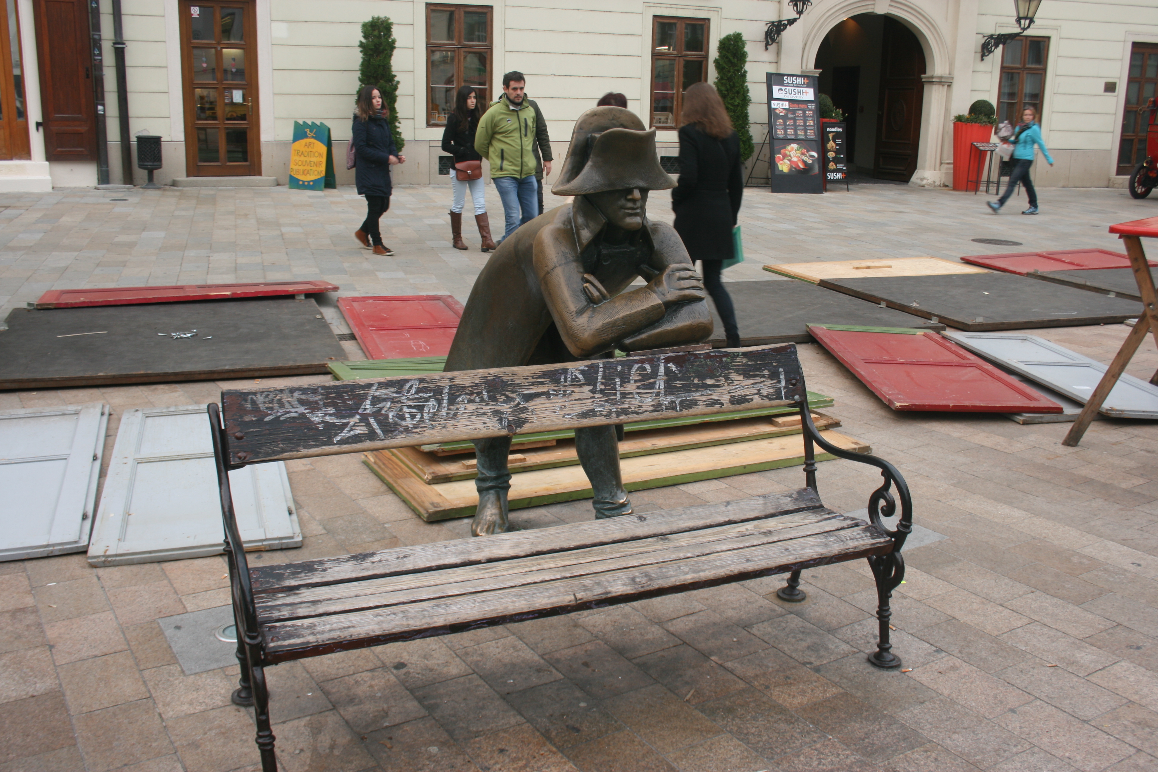 Na pamiątkę pobytu Francuzów w Bratysławie, 26 czerwca 1997 roku, z okazji otwarcia pieszej strefy na Starym Mieście, statua Napoleona opartego o ławeczkę stanęła na Małym Rynku, tuż przed budynkiem Ambasady Francji. Nosi ona oficjalną nazwę “Francuskiego żołnierza”, ale i tak wszyscy wiedzą, że tak naprawdę to sam Napoleon w prostym, szarym żołnierskim szynelu. To jedna z kilku taki rzeźb na Starówce i jedno z ulubionych miejsc do robienia pamiątkowych zdjęć.