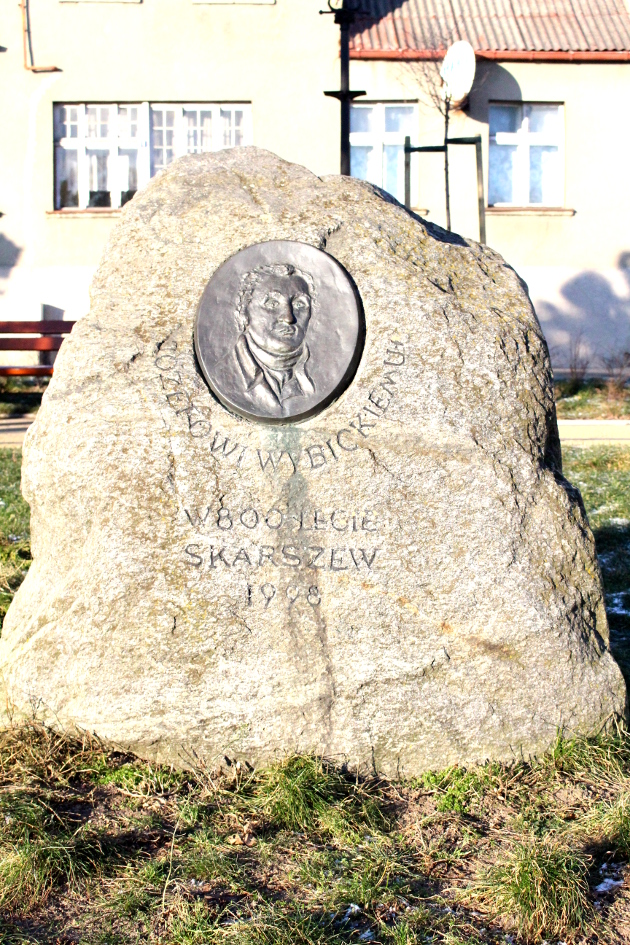 W Skarszewach Józef Wybicki uhonorowany jest dwoma tablicami. Pierwsza widnieje na kamieniu pamiątkowym stojącym na środku rynku opadającego w dół. Została tam umieszczona z okazji 800 lecia miasta w roku 1998.