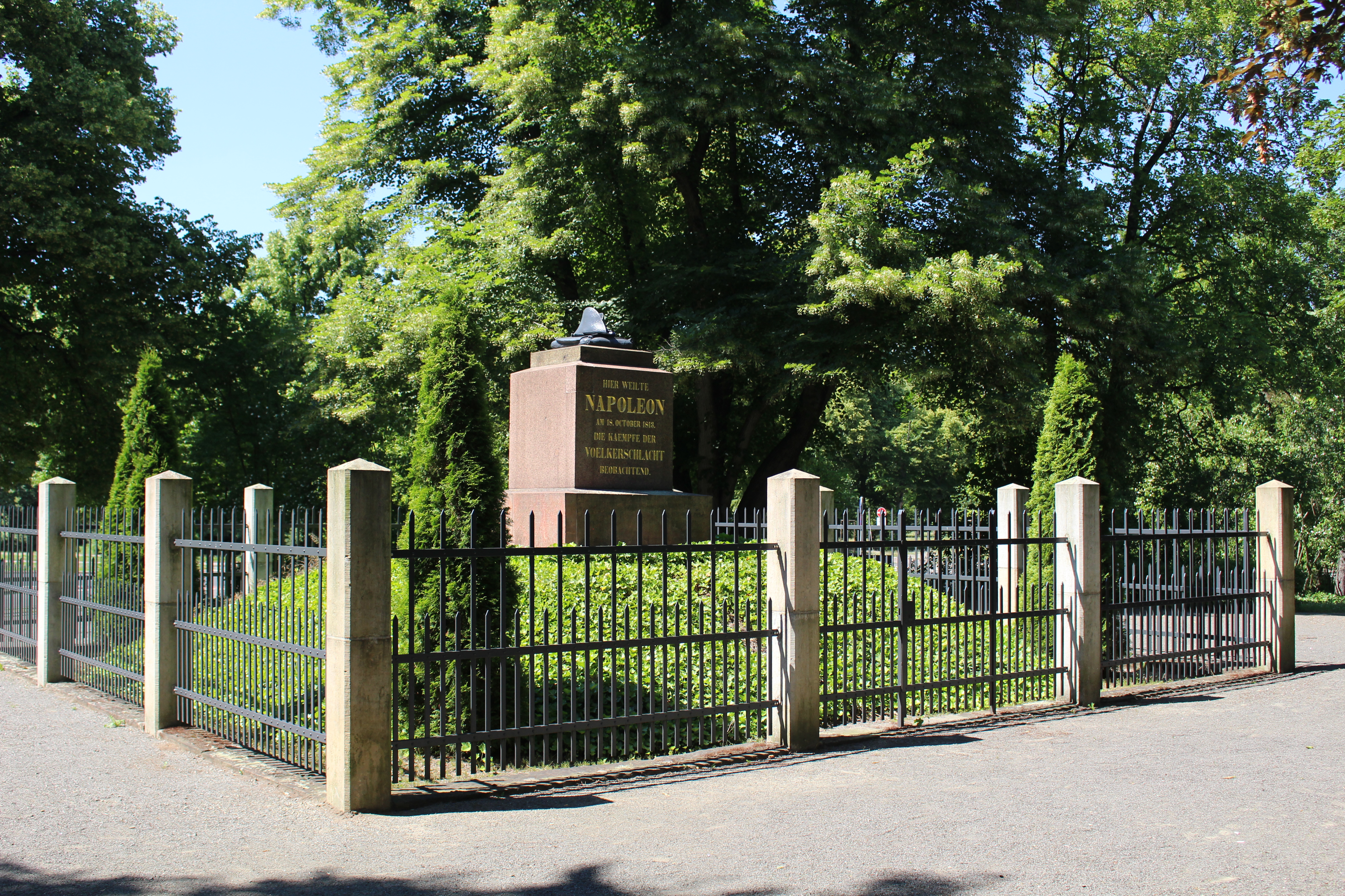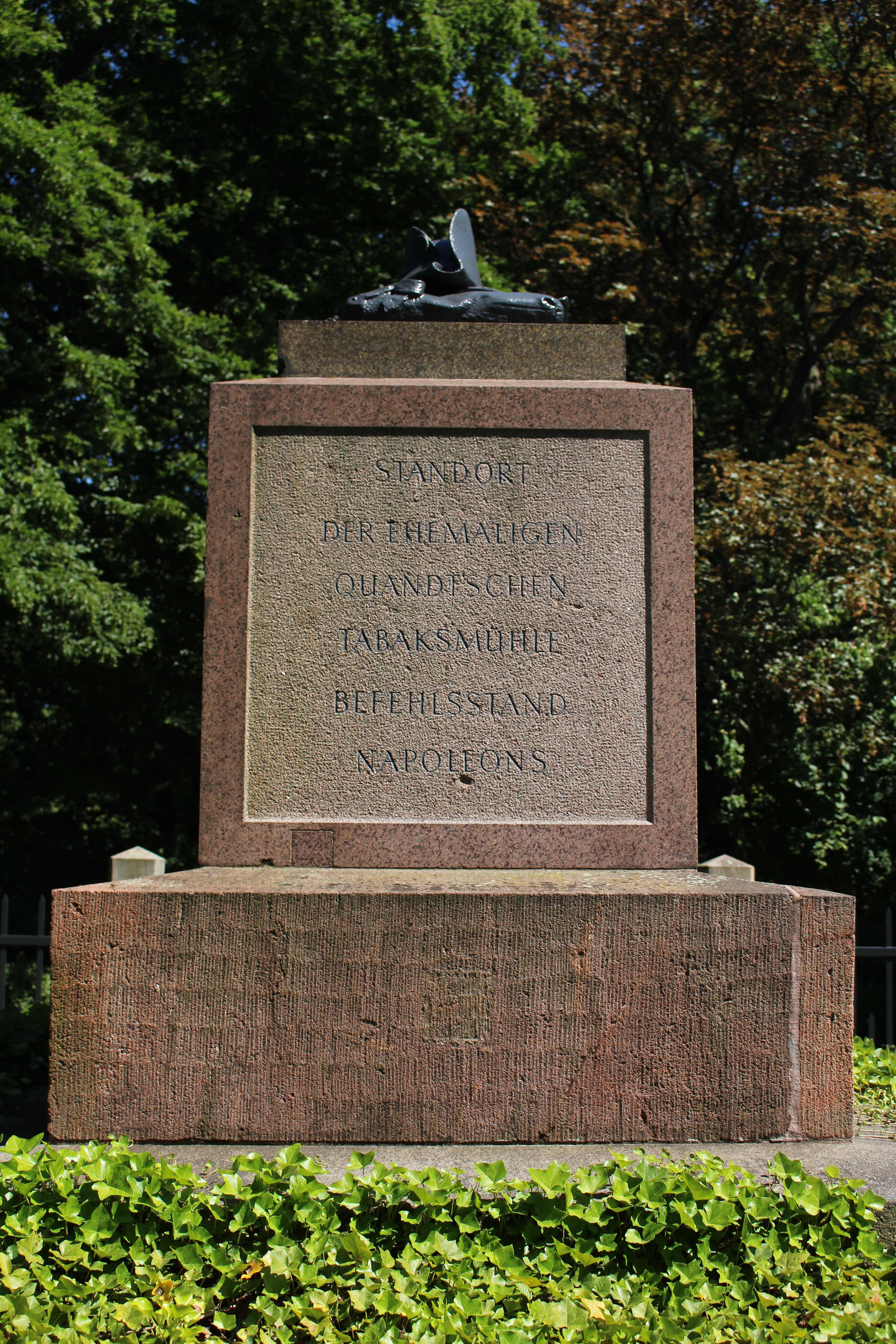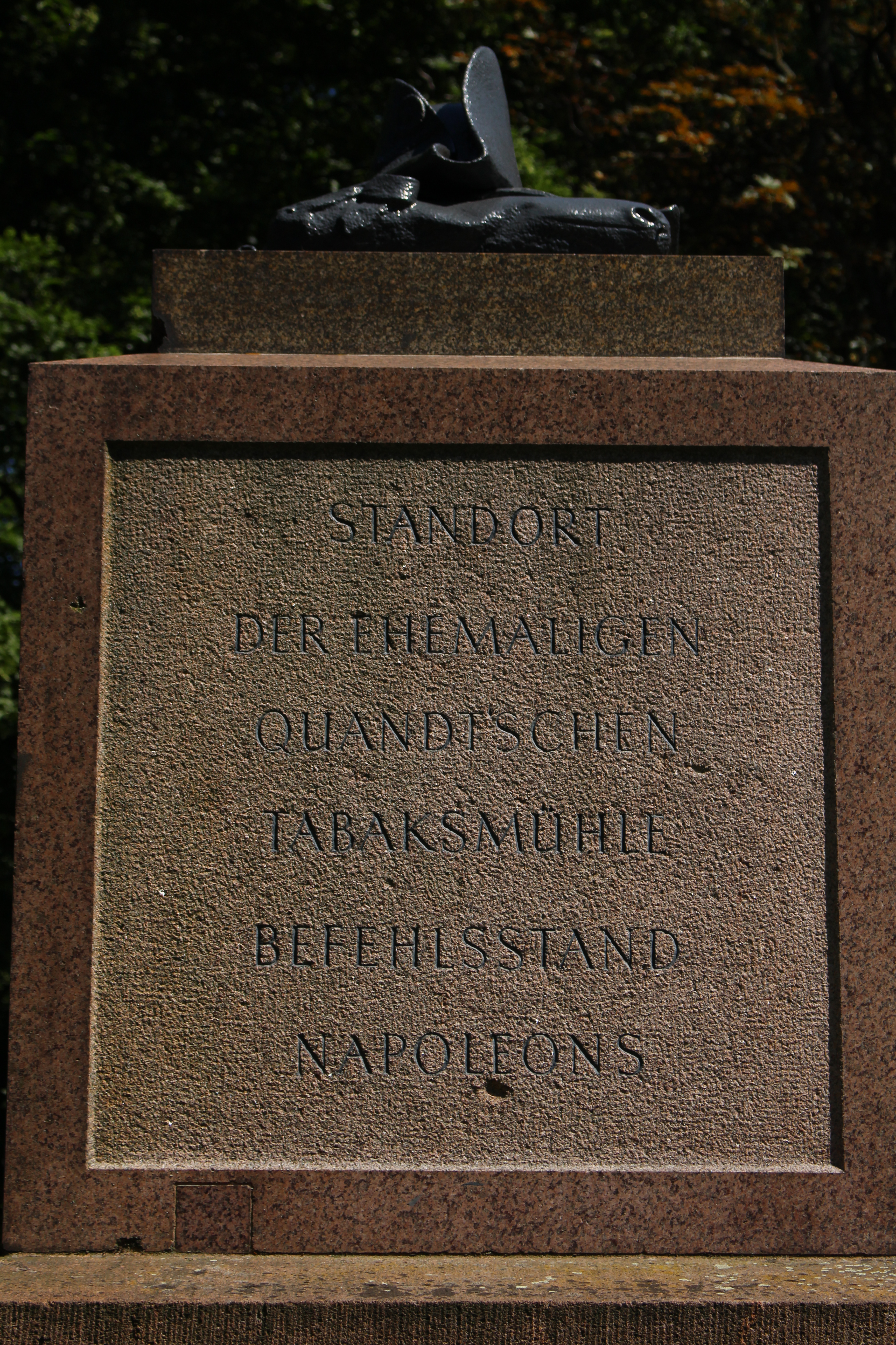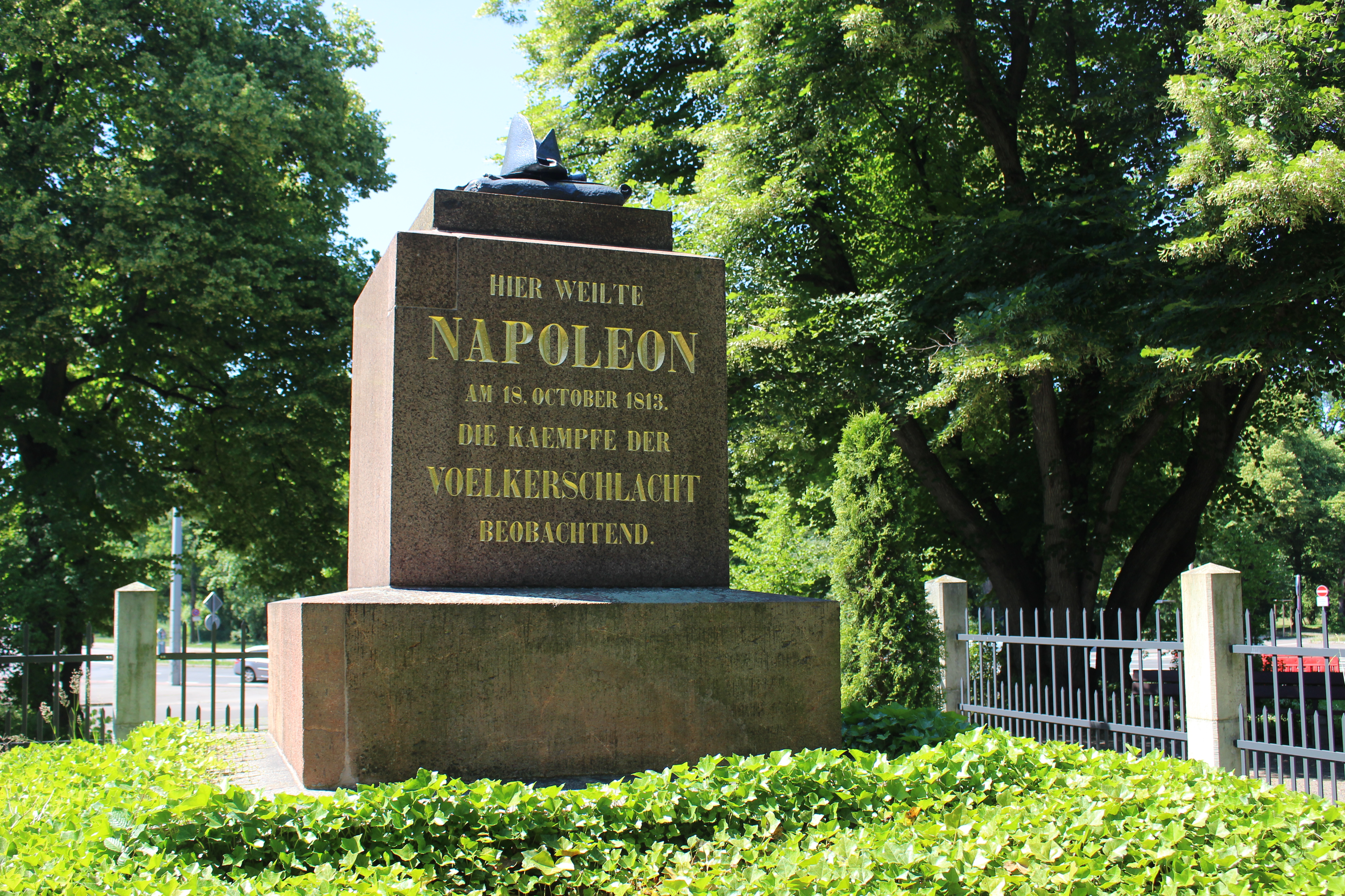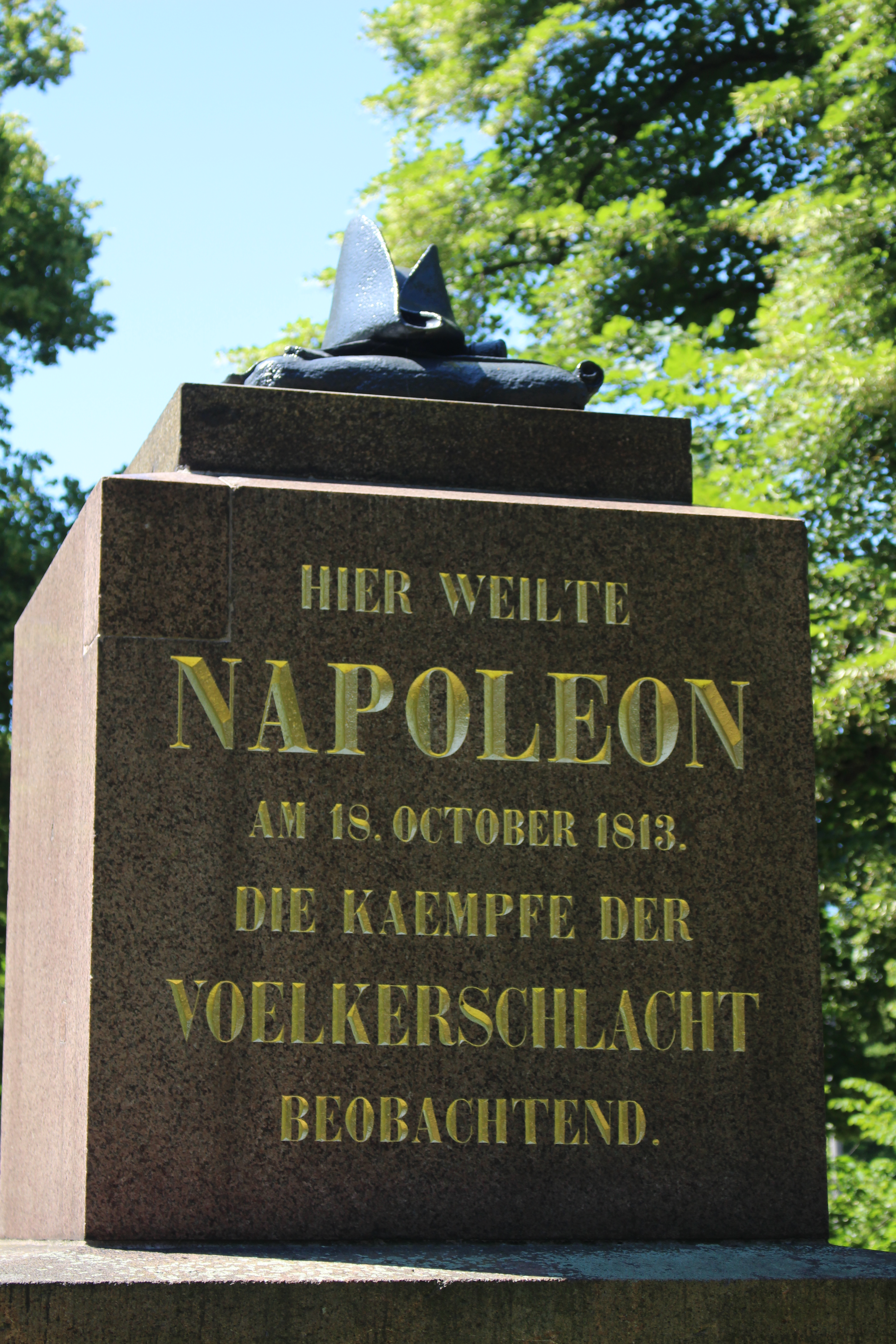 Po raz pierwszy miejsce to upamiętniono w 1832 roku, stawiając nieoznakowany piaskowiec. 25 października 1857 roku “Stowarzyszenie na rzecz świętowania 19 października” (Association for the celebration of the 19th October) postawiło obency pomnik. Jest to granitowy blok z napisami: Z tego miejsca 18 października 1813 roku Napoleon obserwował pole bitwy i Miejsce dawnego młynu tytoniowego Quandta, punkt dowodzenia Napoleona. Monument zwieńczony jest leżącymi: szpadą, słynnym kapeluszem napoleońskim i lunetą. Ogrodzony jest płotem żeliwnym z dwunastoma kolumnami.
