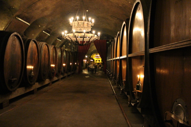Jak wiadomo, cesarz wielkim koneserem win nie był, lubił dwa, trzy gatunki. Czy próbował tutejszych win? Jeśli nie, – ja zrobiłem to w jego imieniu. Pod prawym skrzydłem pałacu znajdują się piwnice wypełnione beczkami z winem. Frankonia słynie ze znakomitych trunków, a najlepszymi są Silvaner i Riesling. W pałacowych piwnicach możemy spróbować win produkowanych przez lokalnych spółdzielców zgromadzonych obecnie w najstarszej spóldzielni winiarni we Frankonii. Wycieczka po piwnicach połączona z degustacją sześciu gatunków wina kosztuje 28 euro. Potem na pamiątkę warto kupić wino w charakterystycznej butelce zwanej Bocksbeutel. Podobno jej kształt pochodzi od moszny byka, w której przed wiekami transportowano wino. Spłaszczona butelka z winem zyskałaby z pewnością przychylność cesarza, ze względu na praktyczność – nie toczy się, więc łatwo nie spada ze stołu.
