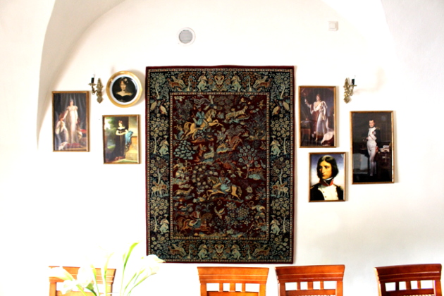 Cesarz spędził tu tylko kilka godzin, zjadł obiad, ale dzięki temu teraz możemy zjeść desery: Pani Walewska, Napoleon, Cesarzowa Józefina. Na obrazach portrety Napoleona, jego kobiet, obrazy z epoki i kopia Gazety Warszawskiej opisujący wizytę cesarza w grudniu 1806 roku.