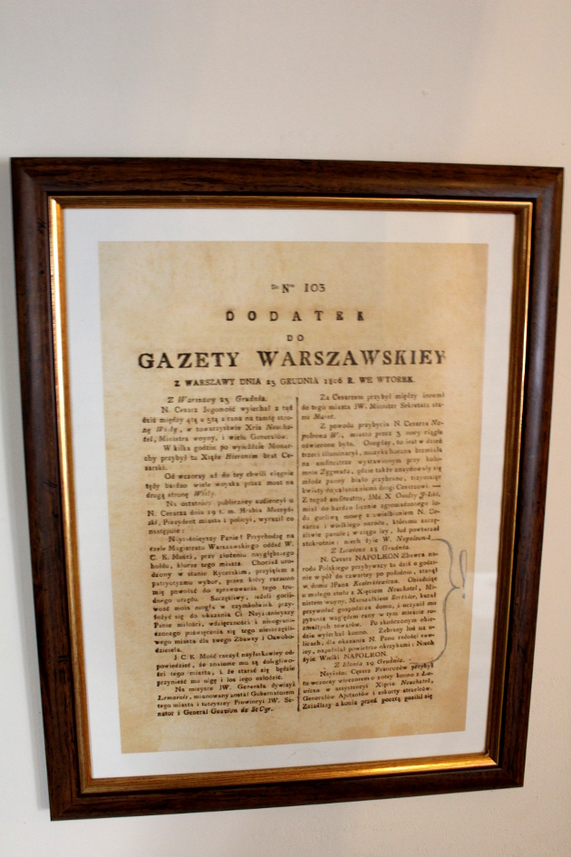 Kopia dodatku Gazety Warszawskiej z opisem wizyty Napoleona w Łowiczu wisząca na ścianie w restauracji Polonia.