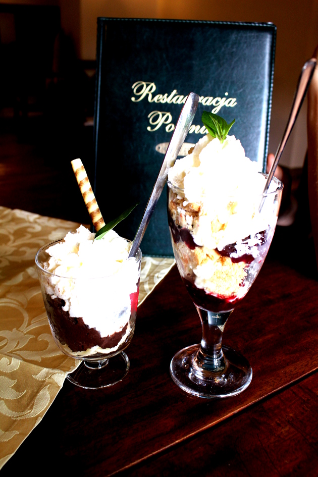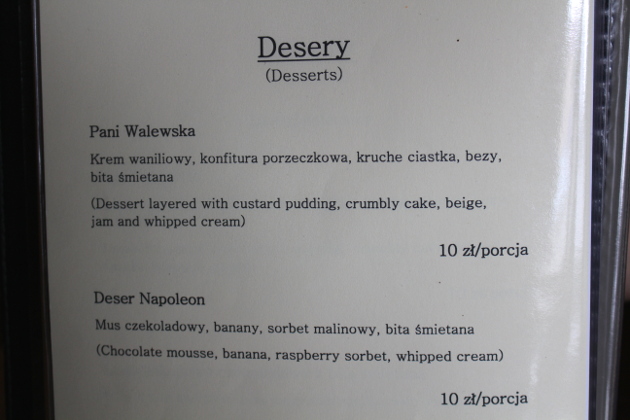 A co w menu? Oczywiście – kurczak po prowansalsku (no, udko kurczaka) w sosie ziołowym. Cena przystępna – 16 zł. Więcej nazw nawiązujących do Napoleona w części deserowej menu. Tak więc Cesarzowa Józefina to: truskawki, beza, chałwa, panna cota, bita śmietana; Napoleon – mus czekoladowy, banan, sorbet malinowy, bita śmietana; Pani Walewska – krem waniliowy, konfitura porzeczkowa, kruche ciastka, bezy, bita śmietana. Wszystkie kosztują po 10 zł. Co ciekawe, kiedy kelnerka przynosi “Napoleona” i “Panią Walewską”, od razu wiem który deser jest który: “Pani Walewska w zgrabnej, wysokiej, smukłej szklanicy, zaś “Napoleon” – w niższym i mniej zgrabnym pucharku.