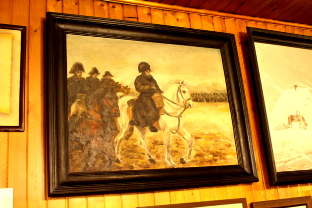 W restauracji na ścianach wiszą obrazy o tematyce napoleońskiej, w karcie niestety nie ma żadnych dań choćby z nazwy nawiązujących do nazwy samej restauracji. Obsługa też nie za bardzo wie, dlaczego restauracja tak się nazywa. Nie ma co tu długo popasać, cesarz pewnie też długo miejsca tu nie zagrzał. Szkoda, istnieją miejsca, w których Napoleonem, jego tradycją się “gra”. Nie trzeba dużo, wystarczy nieco wysiłku i wyobraźni, jak choćby w nieodległym Łowiczu (czytaj TUTAJ)