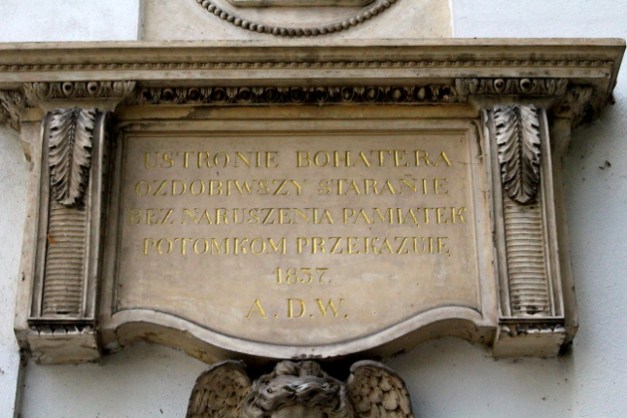 Jak na większości budynków, które w Polsce gościły Napoleona, tutaj także brak jakiejkolwiek informacji o tym, tablicy pamiątkowej o pobycie Napoleona. Za to na bocznej, północnej ścianie zrekonstruowano po II wojnie światowej tablicę z napisem: USTRONIE BOHATERA/OZDOBIWSZY STARANNIE/BEZ NARUSZENIA PAMIATEK/POTOMKOM PRZEKAZUJĘ/1837/ADW/. Nikt jej nie zauważa, nikt prawie nie wie, co znaczy jej treść. PAN nie jest zainteresowana krzewieniu wiedzy historycznej o pałacu, na którym zarabia. A może na poszukiwaczach śladów Napoleona zarobiłaby więcej?