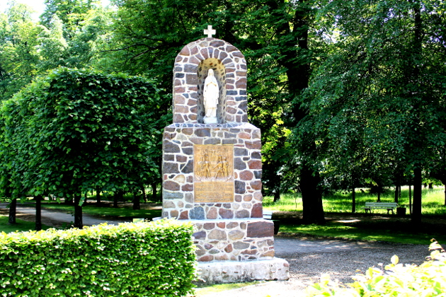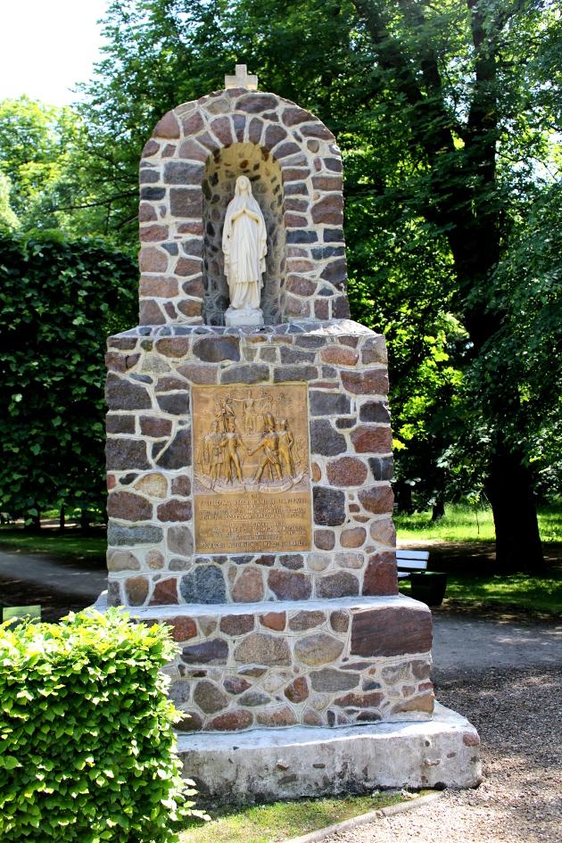 Jednak dla mnie najważniejszy był mały pomnik stojący w parku pałacowym. To nagrobek stojący w miejscu, w którym w 1812 roku pochowano żołnierzy napoleońskich. Usytuowano go niedaleko pałacu, tuż przy żywopłocie. Nagrobek przypomina kapliczkę wiejską.