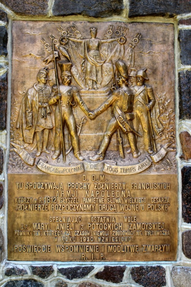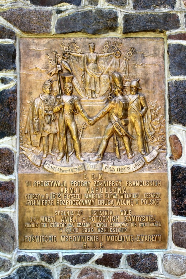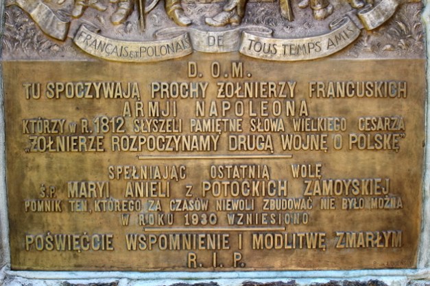 Oddzielny napis poniżej grafiki głosi: “D.O.M. TU SPOCZYWAJĄ PROCHY ŻOŁNIERZY FRANCUSKICH ARMJI NAPOLEONA KTÓRZY W R. 1812 SŁYSZELI PAMIĘTNE SŁOWA WIELKIEGO CESARZA “ŻOŁNIERZE, ROZPOCZYNAMY DRUGĄ WOJNĘ O POLSKĘ”. SPEŁNIAJĄC OSTATNIĄ WOLĘ Ś.P. MARYI ANIELI Z POTOCKICH ZAMOYSKIEJ POMNIK TEN KTÓREGO ZA CZASÓW NIEWOLI ZBUDOWAĆ NIE BYŁO MOŻNA W ROKU 1930 WZNIESIONO. POŚWIĘĆCIE WSPOMNIENIE I MODLITWĘ ZMARŁYM R.I.P.”