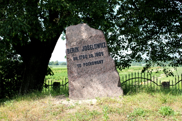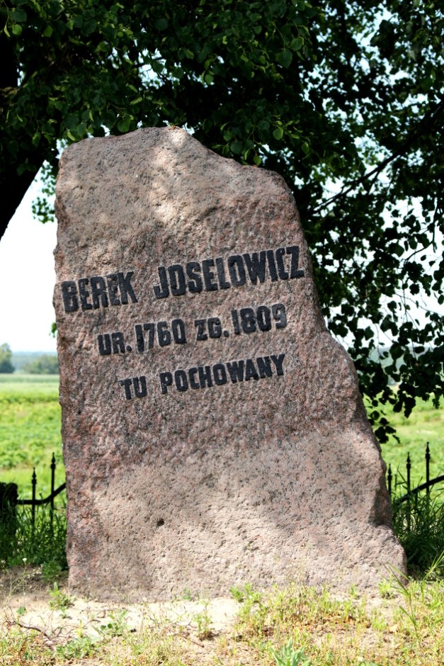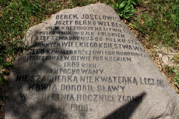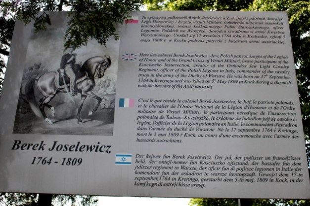 „Berek Joselewicz ur. 1760 – zg. 1809. Tu pochowany”. (błąd w dacie urodzin, Joselewicz urodził się w 1764 roku). Na tablicy na drugim kamieniu wyryto napis: „Berek Joselewicz Józef Berko vel Berk ur. w Kretyndze na Litwie. Pułkownik wojsk polskich, szef szwadronu 5-go pułku strzelców konnych Wielkiego Księstwa Warszawskiego, Kawaler krzyżów Legii Honorowej Militari, zginął w bitwie pod Kockiem 1809 roku. Tu pochowany. Nie szacherką nie kwaterką lecz się krwią dorobił sławy. W stuletnią rocznicę zgonu 1909 r.”