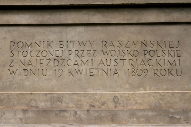 Kilkadziesiąt metrów od niego na niewielkiej polanie otoczonej topolami stoi monumentalny grobowiec. Został wybudowany na podobieństwo grobowca J.J. Rousseau w ogrodzie w Ermenonville, kryje go dwuspadowy dach z akroteriami w stylu klasycystycznym, co jeszcze bardziej przypomina grobowce greeckie. Na szczycie dachu znajdują się wieńce laurowe ze wstęgami. Na tablicy widnieje napis “Pomnik Bitwy Raszyńskiej stoczonej przez Wojsko Polskie z najeźdźcami austriackimi w dniu 19 kwietnia 1809 r.”