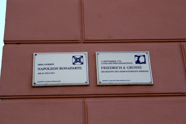 Cesarz odwiedził Torgau tylko raz – 10 lipca 1813 roku. Trwało wtedy zawieszenie broni, po dwóch wygranych przez Francuzów bitwach – pod Budziszynem i pod Lutzen. Nocował w tej samej kamienicy na rynku, w której 2 września 1756 roku noc spędził król pruski Fryderyk II Wielki rozpoczynający wtedy wojnę siedmioletnią. Dzisiaj oba te fakty upamiętniają tabliczki na fasadzie kamienicy. Torgau miało szczęście podczas II wojny, nie było mocno bombardowane, prawie wszystkie budynki przetrwały do dzisiaj.