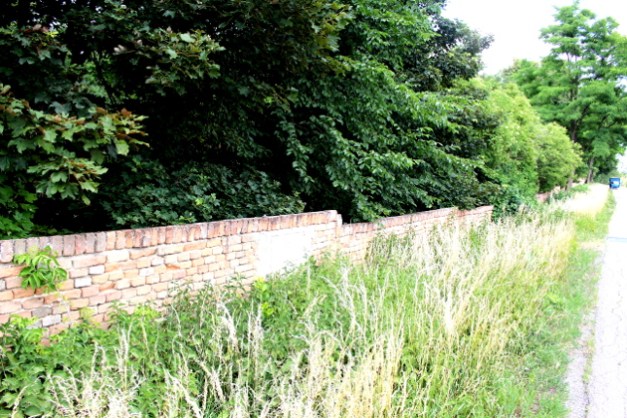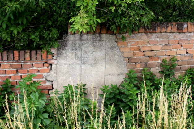 Niski mur otacza ogrody otaczające niegdyś zamek w Sokolnicach na Morawach. Co kilkadziesiąt metrów na ceglastym murze widnieje jaśniejsza łata a na niej równoramienny krzyż i data “1805”.