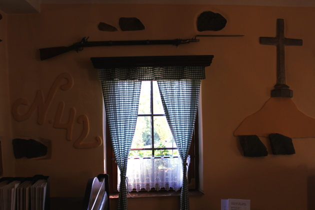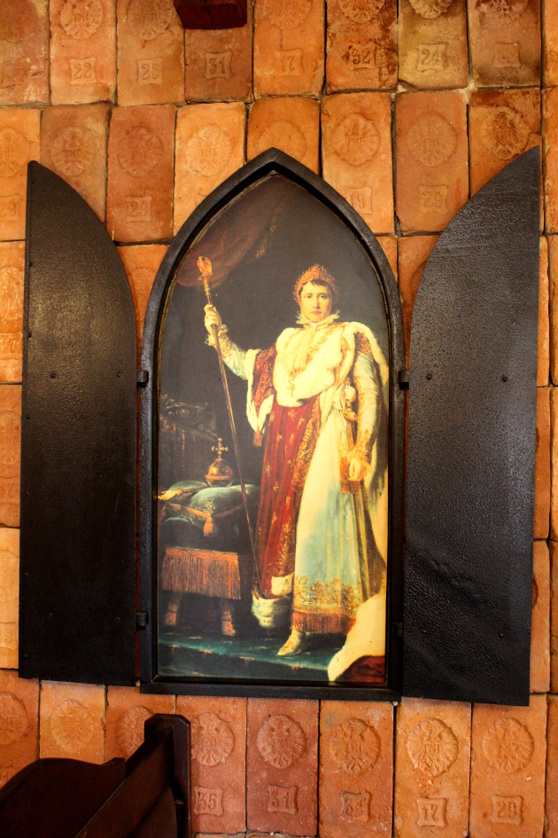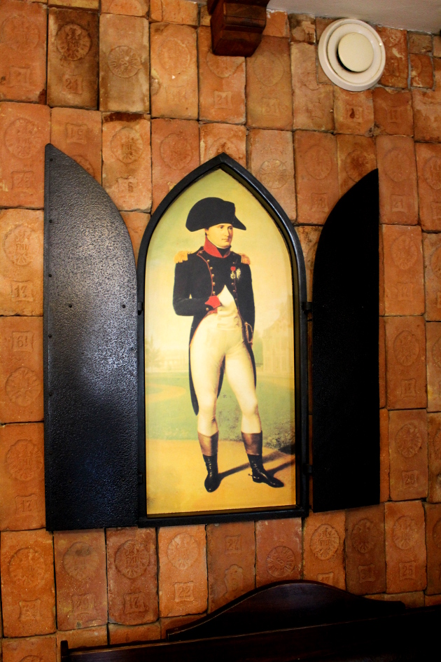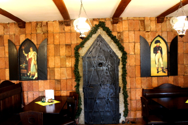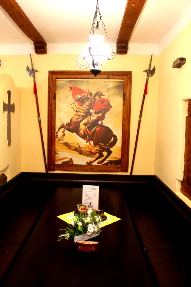 Wystrój sal jadalnych oczywiście nawiązuje do epoki napoleońskiej i cesarza. Wiszą reprodukcje portretów Napoleona m.in. (w stroju koronacyjnym, z przełęczy św. Bernarda, w zielonym mundurze), broń z epoki, Na ścianie data “1805”.
