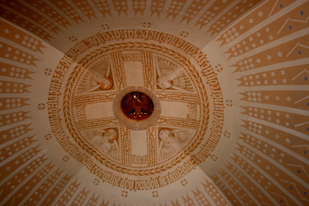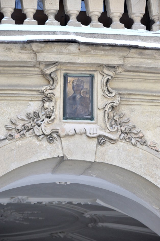W aureoli umieszczono słowa Psalmu: “Prawda i sąd – czyny jego”, imiona Ewangelistów oraz cytat ze staroczeskiej pieśni religijnej: “Panie, zmiłuj się nad nami. Chryste, zmiłuj się nad nami”. Wszystkie napisy są w języku czeskim.