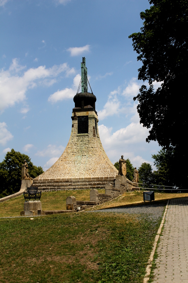 Piramida wysoka na 26 metrów zwieńczona jest miedzianą kulą ziemską a z tej wyrasta wysoki na 10 metrów starosłowiański krzyż symbolizujący Zbawienie. Na krzyżu widnieją płaskorzeźby przedstawiające Jezusa Chrystusa, Marię Pannę, Jana Ewangelistę i Boga Ojca oraz głowę Adama a także pelikana – symbol ofiary Chrystusa. Wszystkie te rzeźby wykonał Frantriśek Anyż.