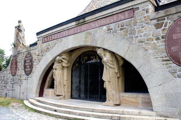 Wejście do kaplicy zdobione jest kratą ochronną oraz alegorią bólu i żalu – postać matki opłakującej syna, żony lub kochanki z wieńcem laurowym dla bohatera a także gałązką lipową – symbolem pamięci. Te rzeźby są autorstwa Ćeneka Viosmika. Po obu stronach wejścia do kaplicy znajdują się granitowe tablice z tekstem ofiarującym pamięci poległych żołnierzy austriackich, francuskich i rosyjskich. Tablice noszą identyczny tekst w języku czeskim, francuskim i niemieckim. Jedynie tablica w języku rosyjskim (na życzenie Rosjan) poleca pamięci tylko żołnierzy rosyjskich.