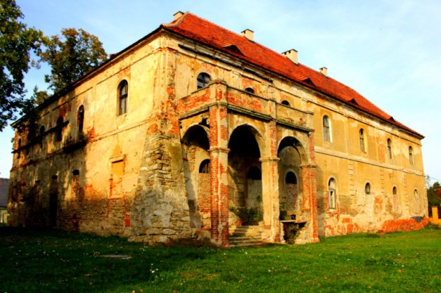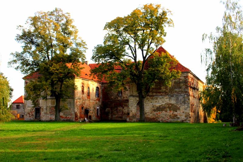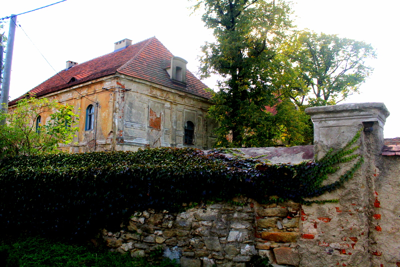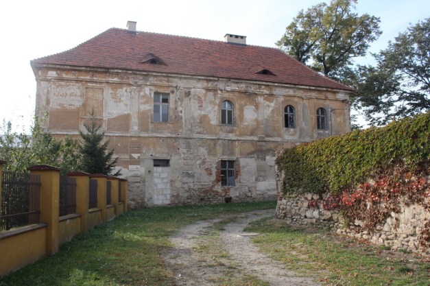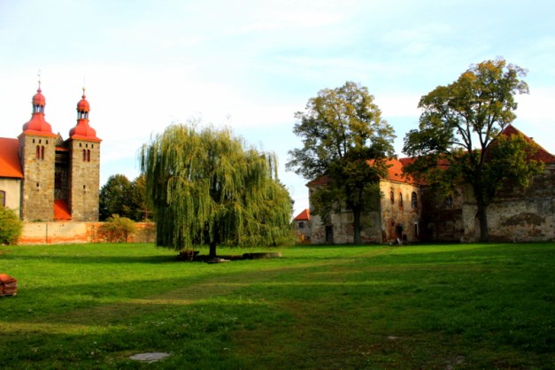 Brama wjazdowa zamknięta, za nią widać fragment pałacu i ruiny klasztoru. Żeby obejrzeć obie budowle trzeba obejść cały teren dookoła. Bryła pałacu cudem przetrwała II wojnę światową i czasy komuny, klasztor to sypiąca się ruina.