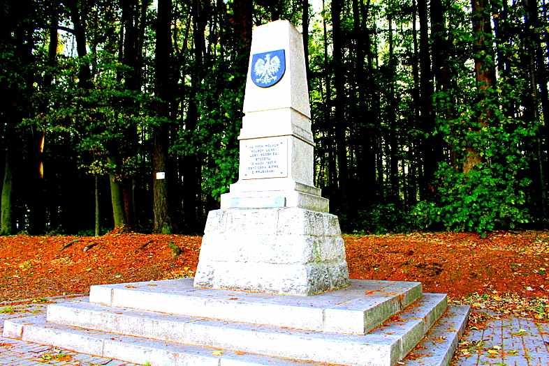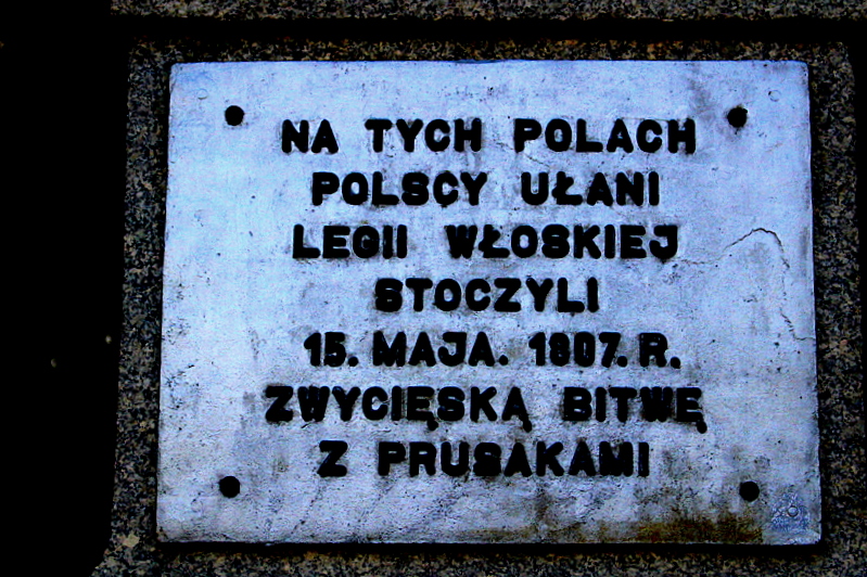 Niecałe sto metrów od zjazdu z obwodnicy Szczawno-Zdroju, kilkanaście kroków od szosy asfaltowej w kierunku Szczawna-Zdroju, wyżej od niej stoi prosty obelisk. Pod tabliczką z orłem na cokole widniej napis: „Na tych polach Ułani Legii Włoskiej stoczyli 15 maja 1807 r. zwycięską bitwę z Prusakami.”