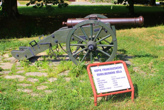Oprócz dioramy bitwy mieszczącej się na miejscowej poczcie (czytaj TUTAJ), w centrum wsi dwie rzeczy upamiętniają bitwę. Replika ośmiofuntowego działa francuskiego stoi na trawniku w centrum rynku, przed urzędem. Waży 360 kilogramów i ma długość 180 cm. W 1988 roku działo umieszczono na wzgórzu Santon (czytaj TUTAJ), gdzie niestety ciągle było narażone na uszkodzenia przez wandali-idiotów. To działo widać jeszcze w broszurach reklamujących pole bitwy pod Austerlitz. W roku 2009 działo przeniesiono na obecne miejsce.