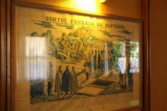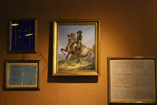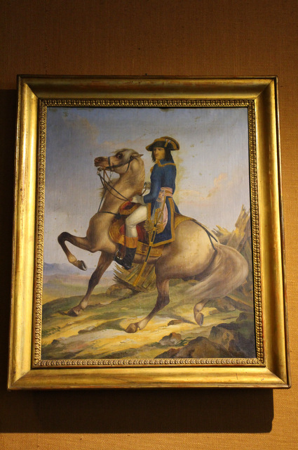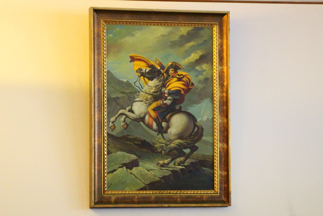 Obok wisi kopia obrazu Davida “Napoleon przekraczający Przełęcz Świętego Bernarda w 1800 roku.”