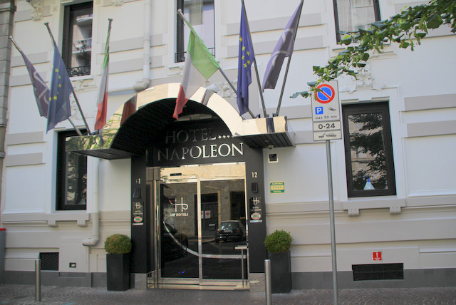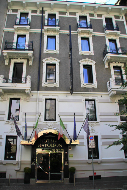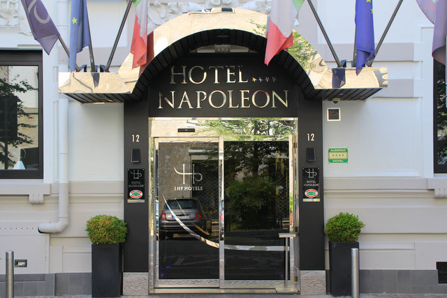 Hotel wciśnięty jest między inne kamienice a wyróżnia go odnowiona dziewiętnastowieczna fasada i duży napis “Napoleon”. Na drzwiach wejściowych widnieje. Wewnątrz praktycznie brak akcentów napoleońskich- kilka grafik wisi w salonie naprzeciwko recepcji.