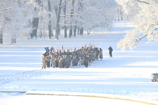 4 grudnia Napoleon na krótko opuścił zamek, by udać się do Spalonego Młyna na spotkanie z cesarzem Franciszkiem I.