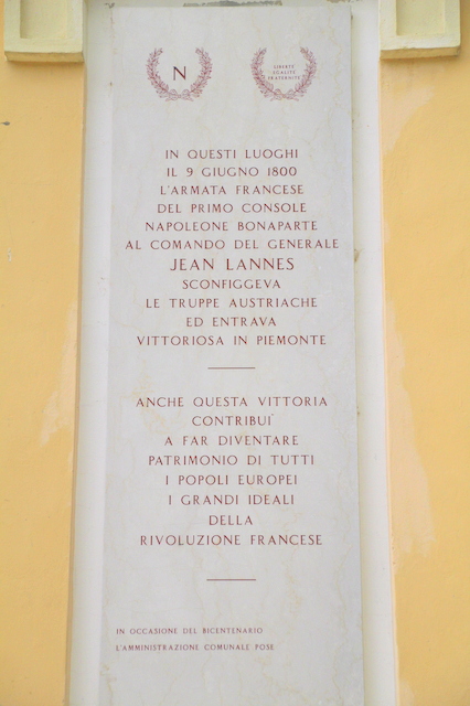 Na ścianie szkoły podstawowej w Montebello della Batalia wisi tablica, którą ufundowały władze miasta. Napis w języku włoski głosi: „W tym miejscu, 9 czerwca 1800 roku armia francuska Pierwszego Konsula Napoleona Bonaparte pod dowództwem generała Jeana Lannes’a pokonała żołnierzy austriackich i weszła zwycięsko do Piemontu/Także to zwycięstwo przyczyniło się do tego, że wielkie ideały Rewolucji Francuskiej stał dziedzictwo wszystkich narodów Europy.”