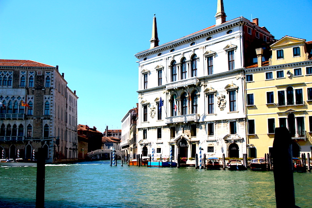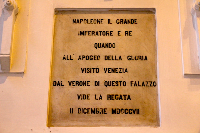 Napis po włosku głosi „Napoleon wielki cesarz u szczytu chwały wizytując Wenecją, z balkonu tego pałacu oglądał regaty 2 grudnia 1807 roku.”