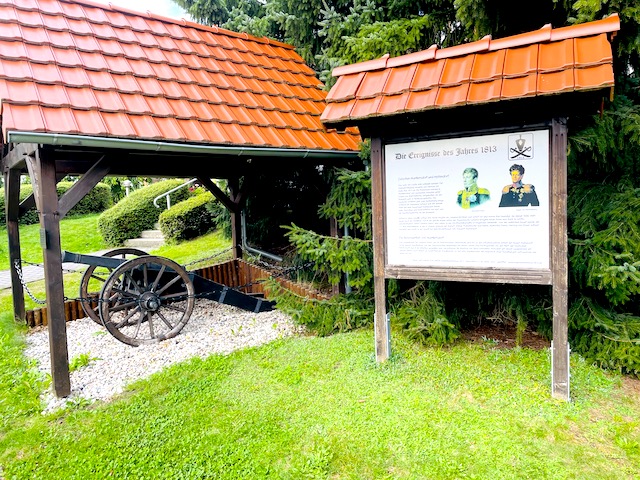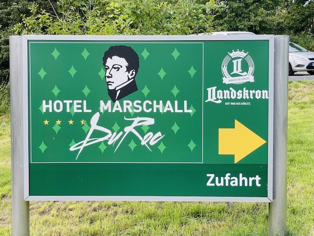 Tablica stojąca przed hotelem opisuje kim był Duroc i okoliczności jego śmierci w 1813 roku we wsi Markersdorf. Tuż obok pod małą wiatą stoi replika armaty z epoki. Kula z podobnego działa zabiła właśnie patrona hotelu.