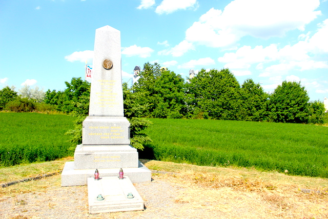 Pomnik stoi na tle betoniarni ZAPA, którą zbudowano tak, że przypomina armatę z czasów napoleońskich wraz z obsługą.