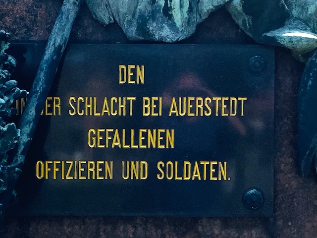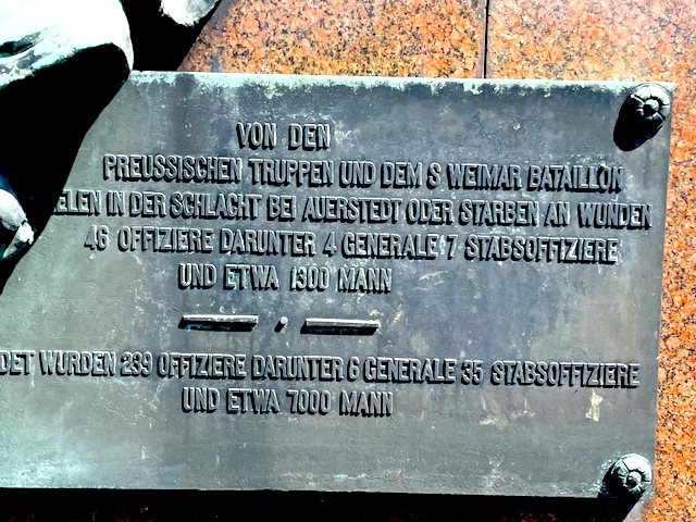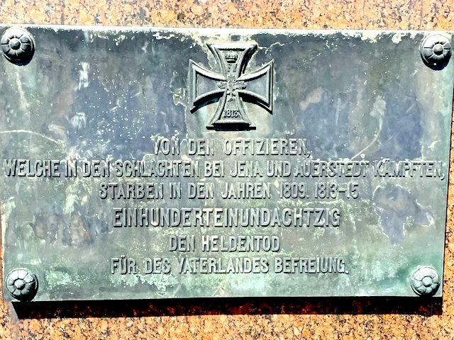 Na kolejnej tablicy z kolei napis głosi: Żołnierzom pruskim oraz 8. Batalionu weimarskiego poległym w bitwie pod Auerstedt, zmarłym i rannym. 48 oficerów niższych, 4 generałów, 7 oficerów sztabowych i ok. 1300 żołnierzom /239 oficerów niższych, 6 generałów i 35 oficerów sztabowych i ok. 7000 żołnierzy.