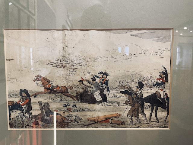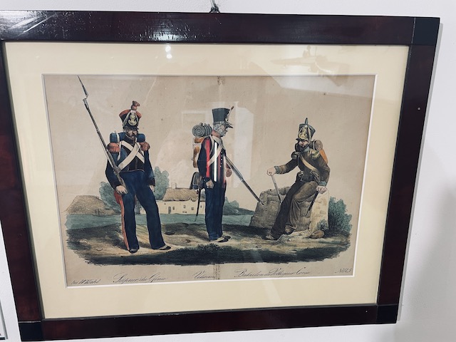 W sąsiedztwie wiszą jeszcze: karykatura pruska z 1813 roku (barwna akwaforta) „Odwrót napoleona z Rosji” , grafika francuska z XIX wieku, „Chirurg piechot armii napoleońskiej” oraz grafika saksońska „Trzej żołnierze Napoleona. Saper, weteran i woltyżer”.