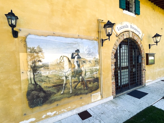 Kiedy już nam się udało znaleźć pomnik upamiętniający bitwę pod Rivoli (a nie było to łatwe), podjechaliśmy do samego miasteczka, żeby poszukać w nim innych śladów napoleońskich. Niestety – jak pisałem już TUTAJ – Muzeum napoleońskie zostało przez władze miejskie zlikwidowane. Trzy minuty spacerkiem od Placu Napoleona, przy którym znajdowało się jeszcze dwa lata temu muzeum, jeszcze tej wiosny działała restauracja o nazwie „Locanda Bonaparte”. Niestety, zarówno na kracie zamykającej na wieki lokal, jak i na jego stronie internetowej wisi ten sam napis: „Zamknięte na zawsze. Serdeczne podziękowania dla wszystkich naszych klientów. To był dla nas zaszczyt gościć Was.”