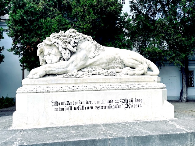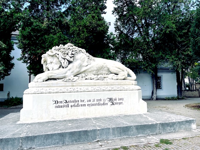 50 lat po bitwie pod Aspern, arcyksiążę Albrecht austriacki, syn arcyksięcia Karola, wydał rozkaz wybudowania pomnika upamiętniającego zwycięską bitwę. Autor pomnika pamiętając jak skończyła się cała wojna 1809 roku, wyrzeźbiła lwa zwycięskiego, ale smutnego po przegranej kampanii.
